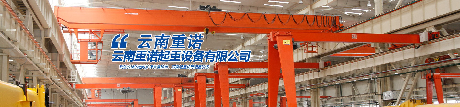 云南重諾起重設備有限公司主要經營銷售:橋式起重機、門式起重機、懸掛起重機、旋臂起重機、電動葫蘆、升降貨梯、電動平車、液壓升降平臺、升降搬運設備、起重配套工具、起重軸承、起重機各部位配件。公司產品暢銷全國各地,深受用戶的信賴?! 」就ㄟ^了ISO9001 :2000質量體系認證具備320T及以下噸位橋式起重機、280T及以下噸位門式起重機特種設備制造許可證.320T及以下起重機的特種設備安裝......更多>>